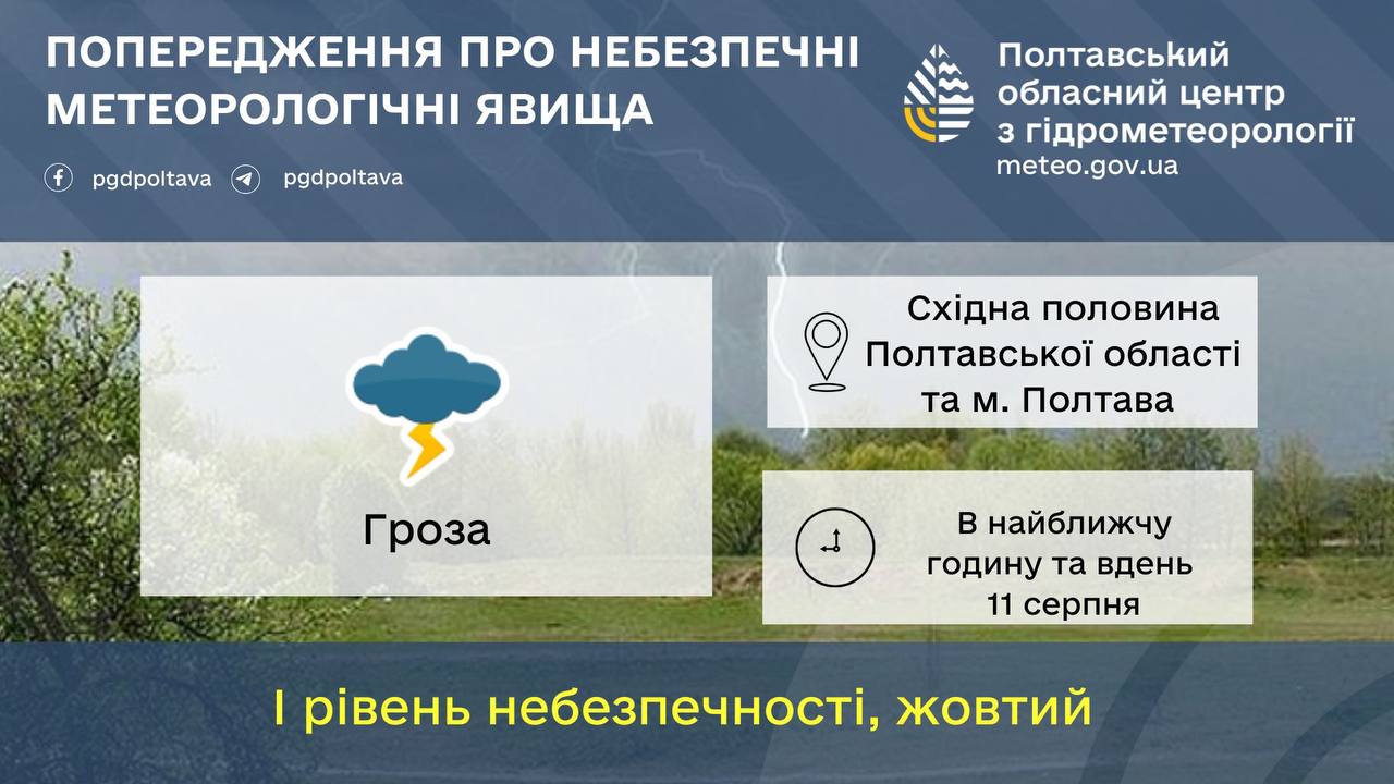Жителів Кременчука та східної частини Полтавської області попереджають про наближення грози. Сьогоднішній день принесе з собою ризики погодних ускладнень, у зв’язку з чим було оголошено жовтий рівень небезпеки.